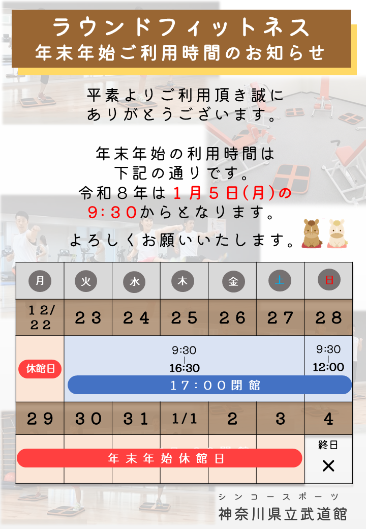 武道館は空調が整備されていますが、熱中症予防のため水分・塩分補給などご自身で対応してください。